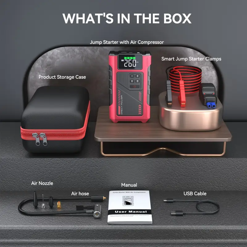 A Car Starter With An Air Compressor, Emergency Starting Power, Car Battery Charging Auxiliary Starter, Battery Jump Starter, Portable Car Battery Jump Box, Car Jump Starter Suitable For 12V (7.5L Gasoline 6.0L Diesel) 150PSI Tire Inflator Combination, Lithium Battery Jump Pack With Air Pump, With LED Emergency Lighting, Large Capacity Power Bank